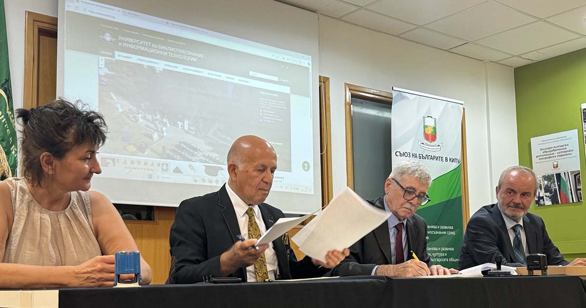 Στις 24 Σεπτεμβρίου 2025, στο Πολιτιστικό και Εκπαιδευτικό Κέντρο της Ένωσης Βουλγάρων στην Κύπρο στη Λευκωσία, υπογράφηκε Μνημόνιο Συνεργασίας ανάμεσα στην Ένωση και το Πανεπιστήμιο Βιβλιοθηκονομίας και Τεχνολογιών Πληροφόρησης (UniBIT). Η συμφωνία προβλέπει κοινές δράσεις σε εκπαίδευση, έρευνα και πολιτιστική ανταλλαγή, με έμφαση στη διατήρηση της βουλγαρικής κληρονομιάς, αλλά και στη συνεργασία με κυπριακούς φορείς για τουρισμό, ανώτατη εκπαίδευση και πολιτισμό.