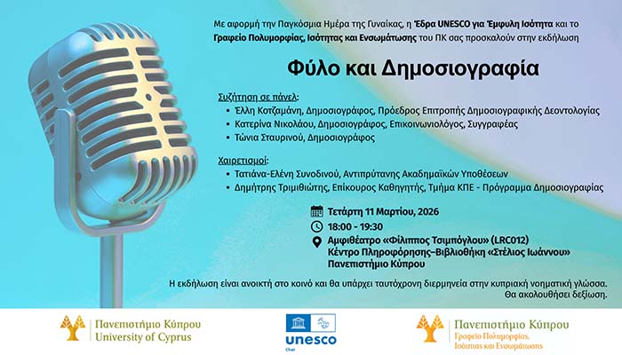 Με την ευκαιρία της Παγκόσμιας Ημέρας της Γυναίκας, η Έδρα UNESCO για Έμφυλη Ισότητα και το Γραφείο Πολυμορφίας, Ισότητας και Ενσωμάτωσης του ΠΚ σας προσκαλούν στην εκδήλωση με τίτλο «Φύλο και Δημοσιογραφία».